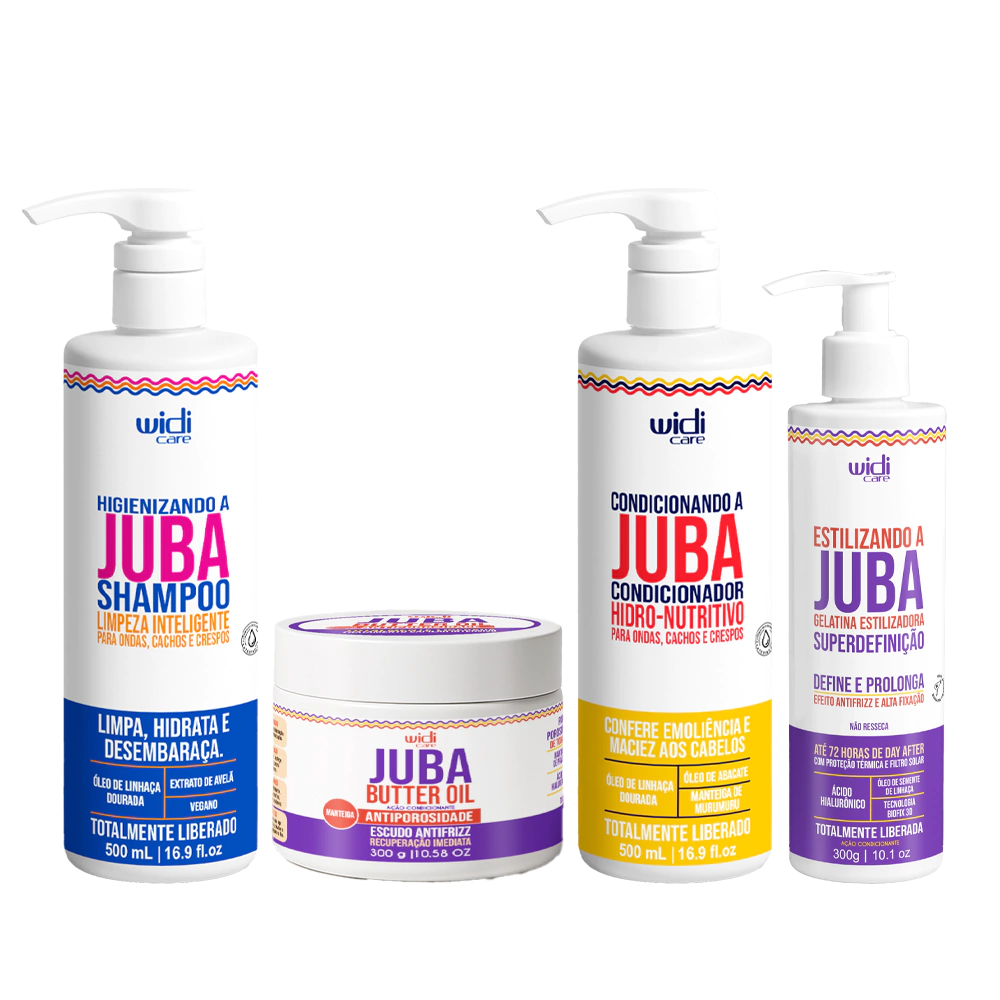 | como usar | Shampoo Higienizando A Juba 500 ml Aplique o shampoo nos cabelos molhados, massageando o couro cabeludo e distribuindo-o pelos fios. Deixe agir enquanto espalha a espuma por todo o comprimento do cabelo e, em seguida, enxágue completamente. Condicionador Hidro-Nutritivo Condicionando A Juba 500ml Após lavar os cabelos com o Higienizando a Juba Shampoo, aplique uma pequena quantidade do Condicionando a Juba ao longo do comprimento e pontas dos fios. Deixe agir por 3 minutos e enxágue bem. Máscara Widi Care Juba Butter Oil Manteiga Antiporosidade 300g Após higienizar seus fios, aplique uma quantidade suficiente da Butter Oil ANTIPOROSIDADE Juba, enluvando,os bem. Deixe agir de 3 a 5 minutos. Enxágue abundantemente, retirando todo o produto e modele como preferir com o seu Juba favorito. DICA: Pra um tratamento ainda mais intenso, pode ser usado por horas, deixando agir nos fios antes de lavar. Gelatina Widi Care Juba Estilizando a Juba Super Definição 300g Com os cabelos devidamente higienizados e tratados, aplique a gelatina mecha a mecha, de forma uniforme, no comprimento e nas pontas. Desembarace os fios e finalize como desejar. Deixe secar naturalmente ou utilize um difusor. |
